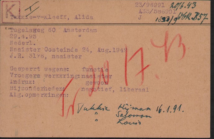 Zij woonden allen op de Tugelaweg. Alida en Hijman waren de ouders van Salomon en Tukkie. Haar man overleed op 11 juni 1941 in Amsterdam. Alida kwam tegelijk met Salomon aan in Westerbork en gingen tegelijk op transport. Het persoonsbewijs nummer van Alida staat zowel op haar persoonskaart, als op deze kaart. 586901. Zij werden in Sobibor vermoord.
